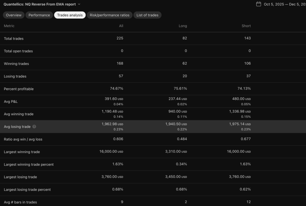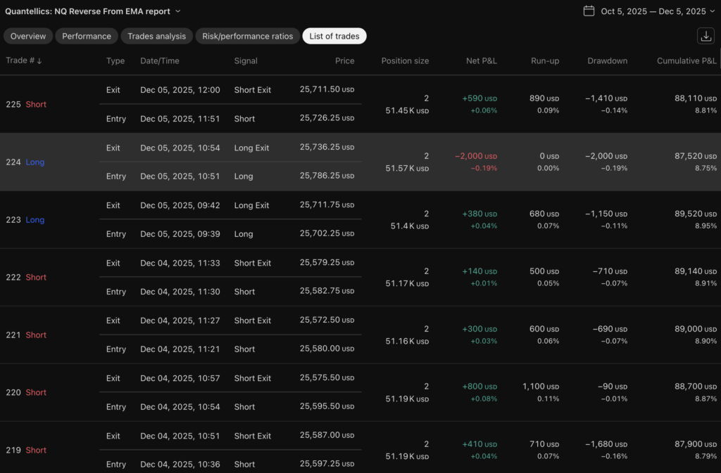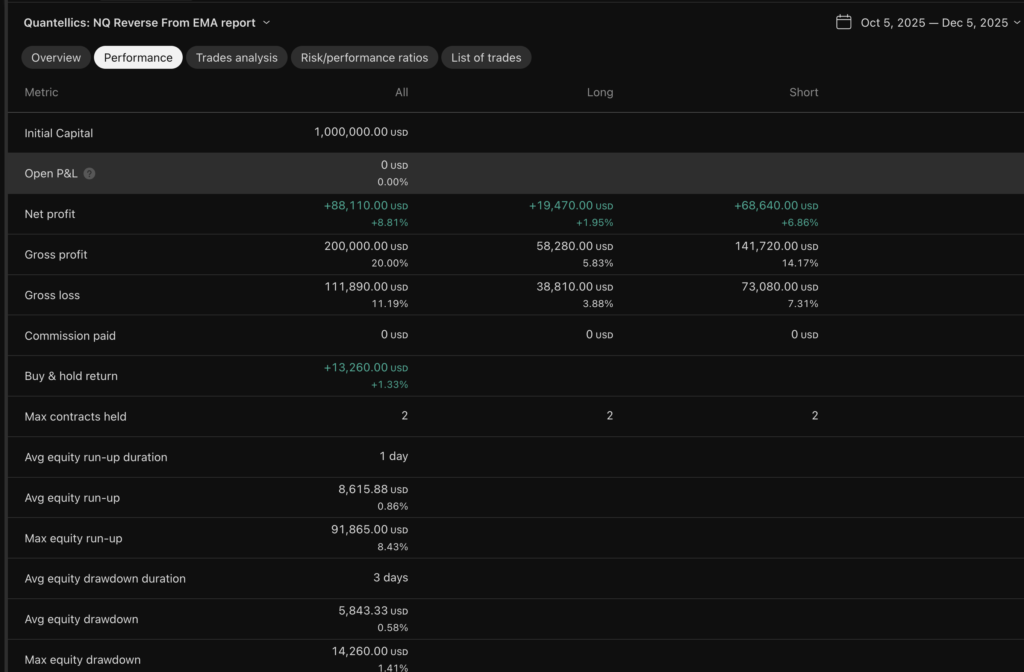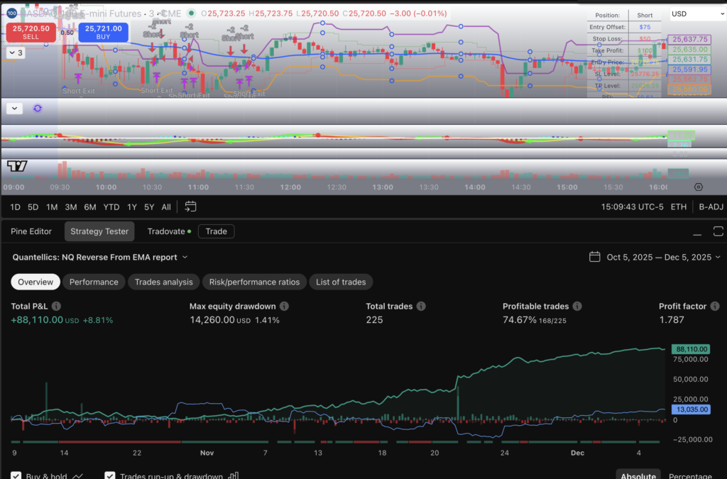 The Quantellics: NQ Reverse From EMA strategy is built specifically for NQ futures traders who want clean, rule-based reversals off intraday extremes — without staring at every tick.